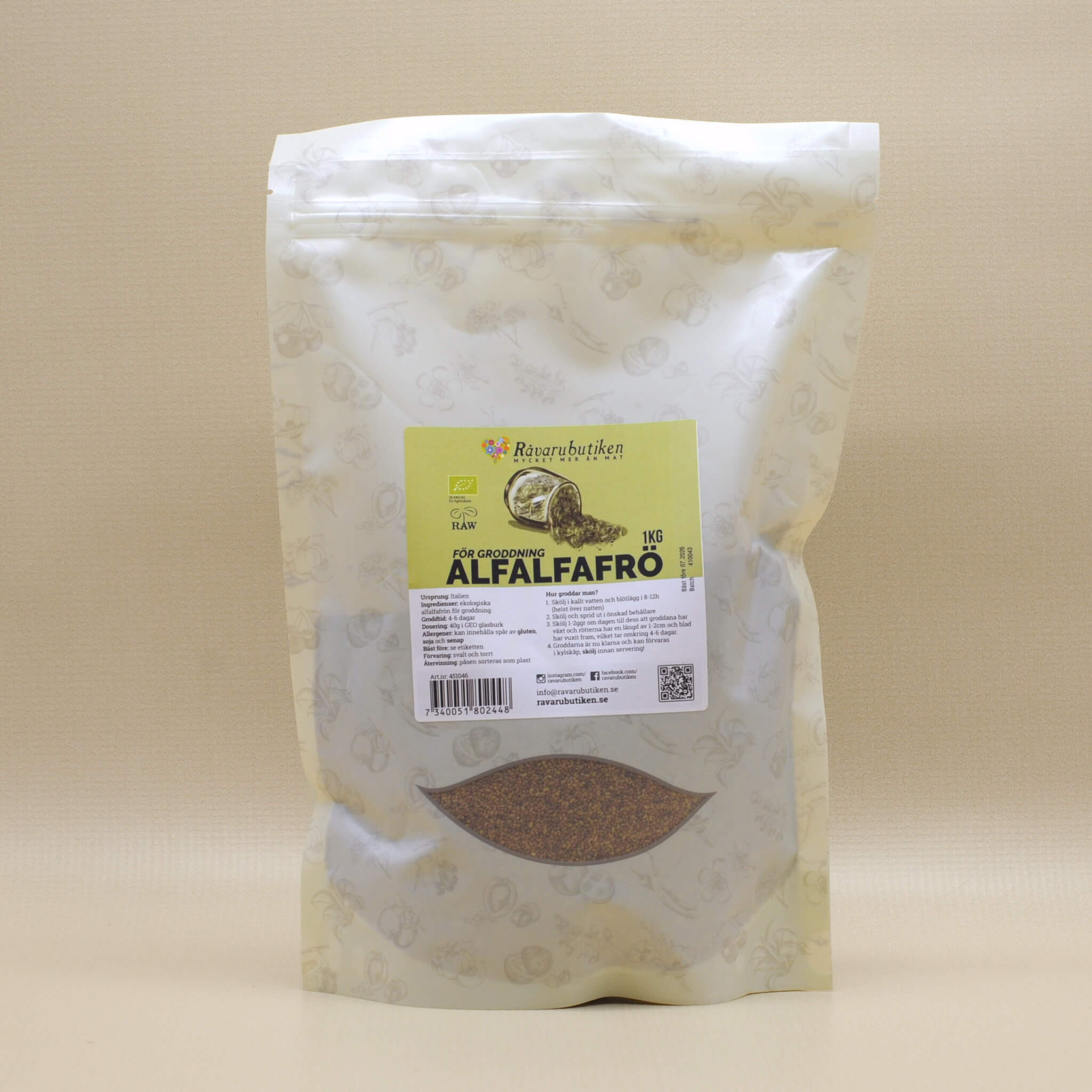 Ingredienser: ekologiska alfalfafrön för groddning