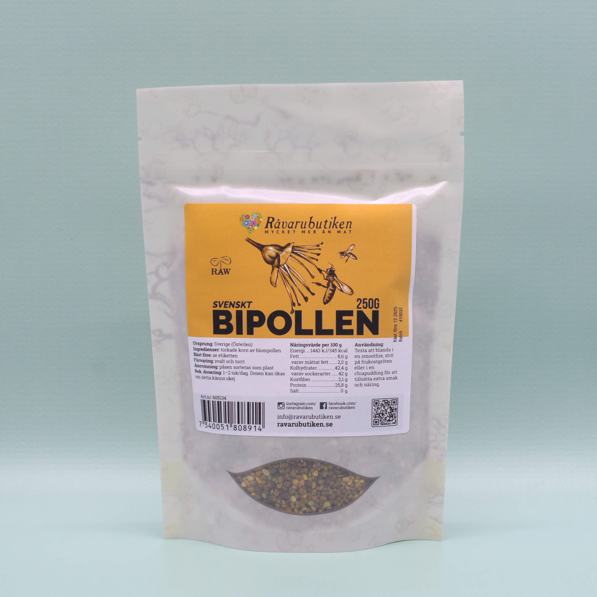 Svenskt bipollen produceras i liten skala och är därför relativt ovanligt. Våra biodlare arbetar enligt ekologiska principer och bina samlar pollen från skogar och öppna landskap.