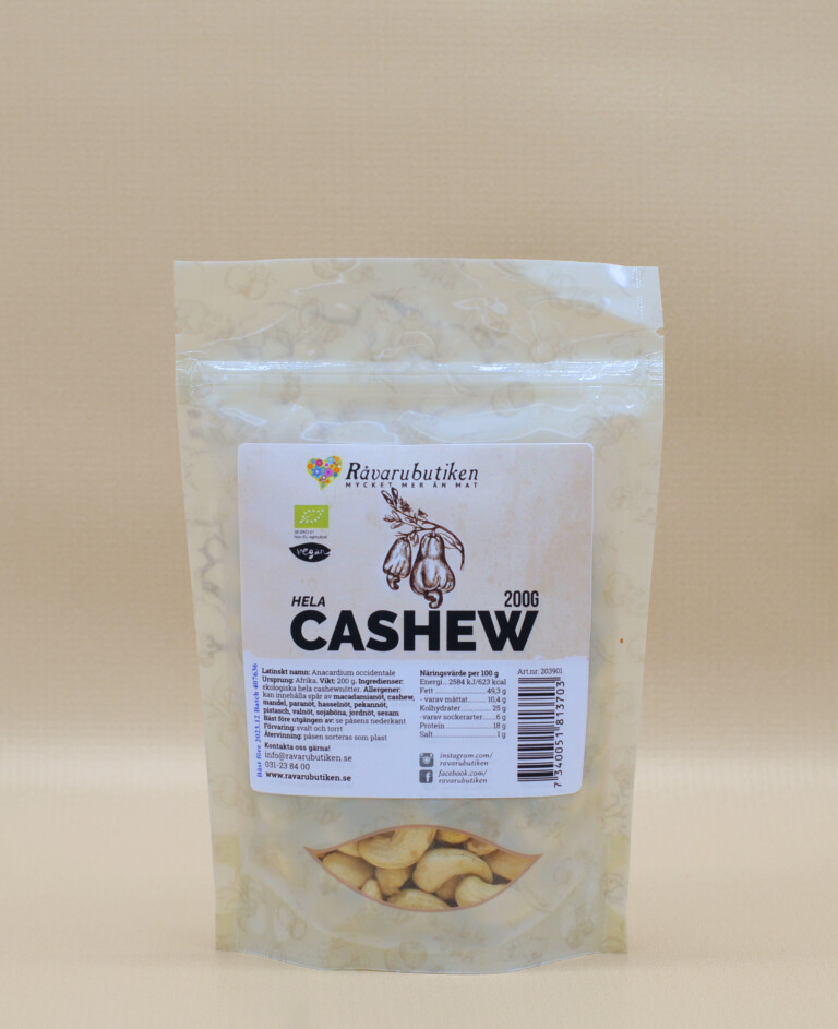 Råvarubutikens ekologiska cashewnötter odlas genom kooperativ i Afrika och Asien. Kooperativen ger jordbrukare möjlighet till utbildning inom områden som korrekt beskärning, organisk kompostering, bearbetning och lagring efter skörd.