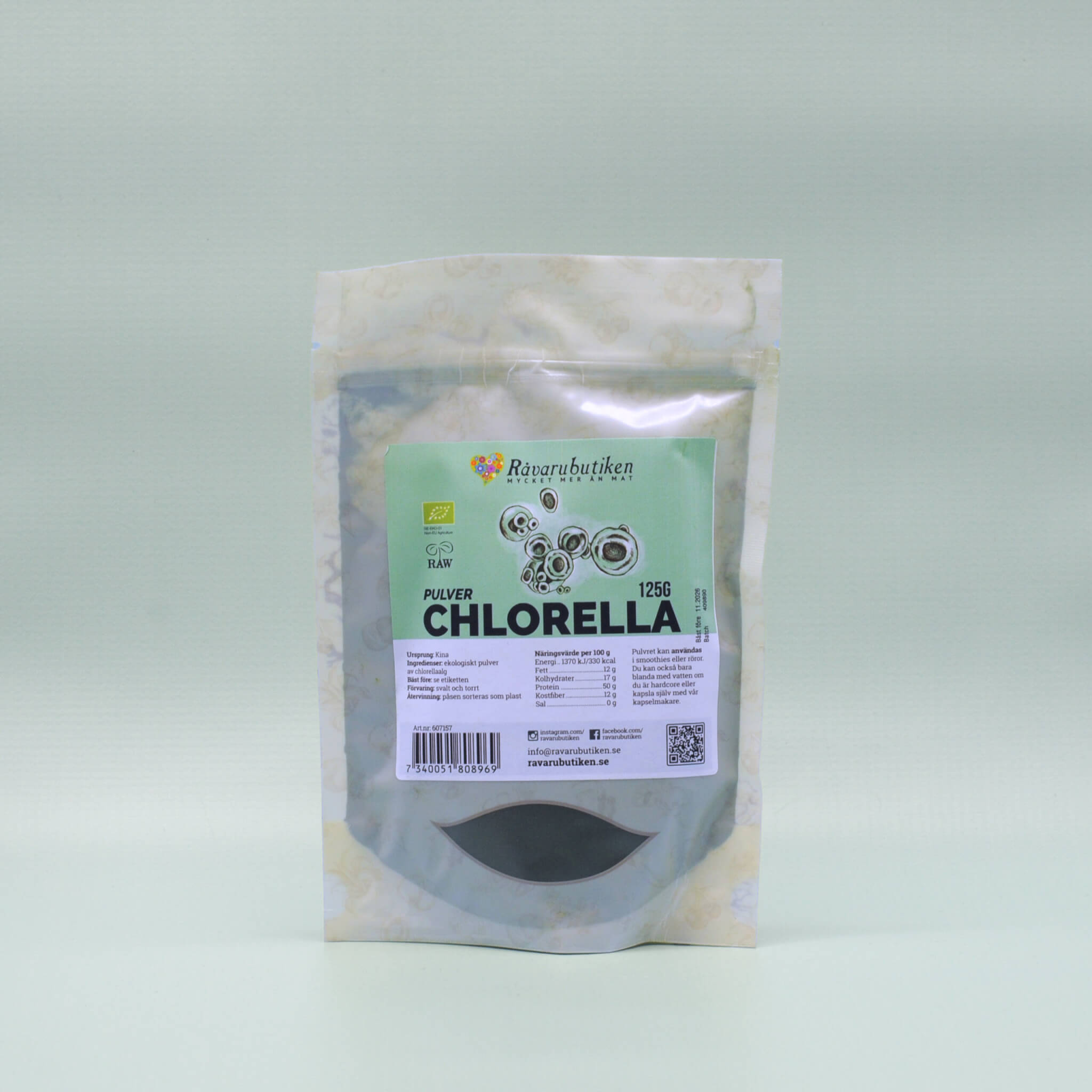 Innehåll: Pulver av torkad chlorellaalg (Chlorella vulgaris).