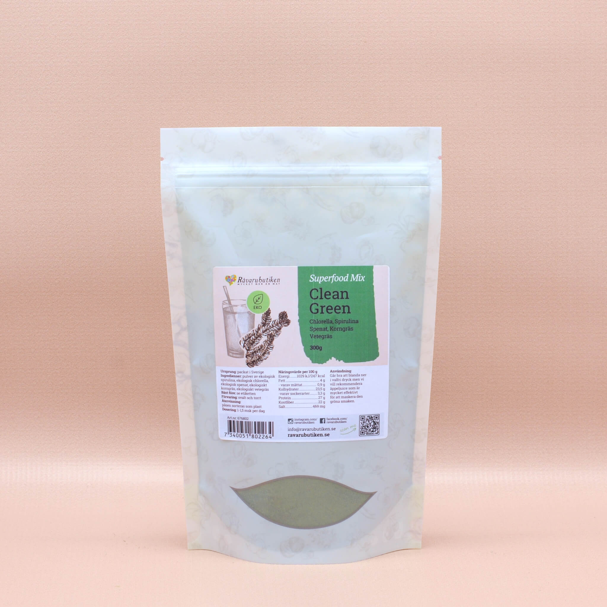 Clean Green är en ekologisk superfood mix med gröna ingredienser som gör det enkelt att blanda en näringsrik dryck hemma. Blandningen består enbart av utvalda gröna pulver från Råvarubutikens eget sortiment.
