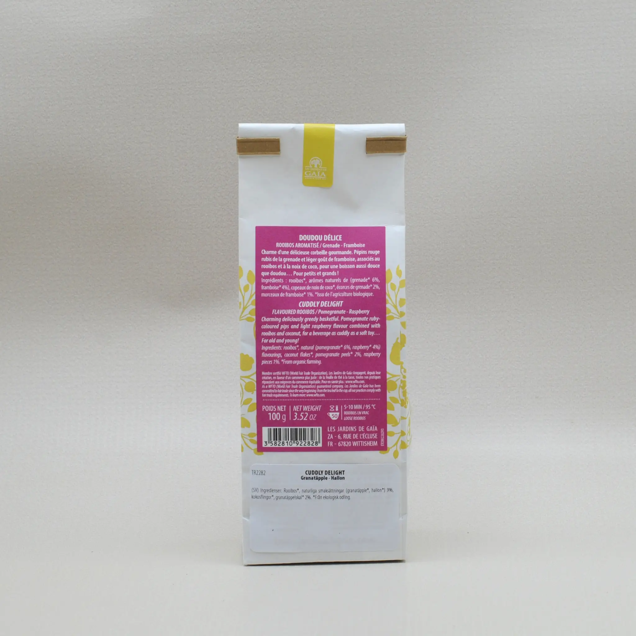 Förföriskt läcker och generös blandning. Granatäpplets rubinröda kärnor och en lätt hallonsmak kombineras med rooibos och kokos för en dryck som är lika mysig som en mjuk leksak… För både unga och gamla!