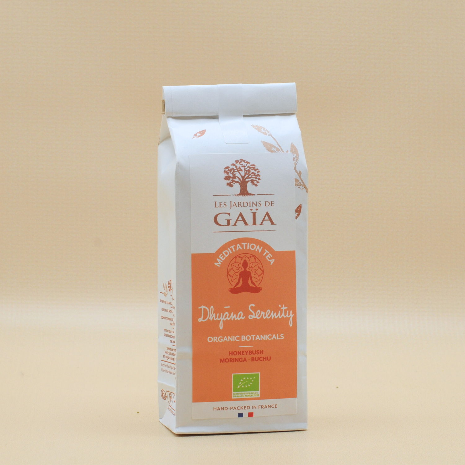 Dhyāna Serenity – Ekologiskt örtte med honeybush, moringa & buchu En harmonisk och rogivande örtblandning skapad för stunder av stillhet och inre balans. Dhyāna Serenity kombinerar den mjuka sötman från honeybush med gröna, livfulla toner av moringa och den aromatiska friskheten från buchu. Citron och lakrits rundar av smaken med en frisk och mild sötma som gör varje kopp till ren avslappning. Smakprofil: Söt och len honeybush som bas. Friska, gröna toner från moringa. Aromatiska inslag av buchu med lätt citruskaraktär. Subtil lakritston som ger balans och rundhet. Passar till: Ett te för lugna stunder, meditation eller kvällsro. Lika gott varmt som kallt, gärna tillsammans med frukt eller choklad för en mjuk kontrast.