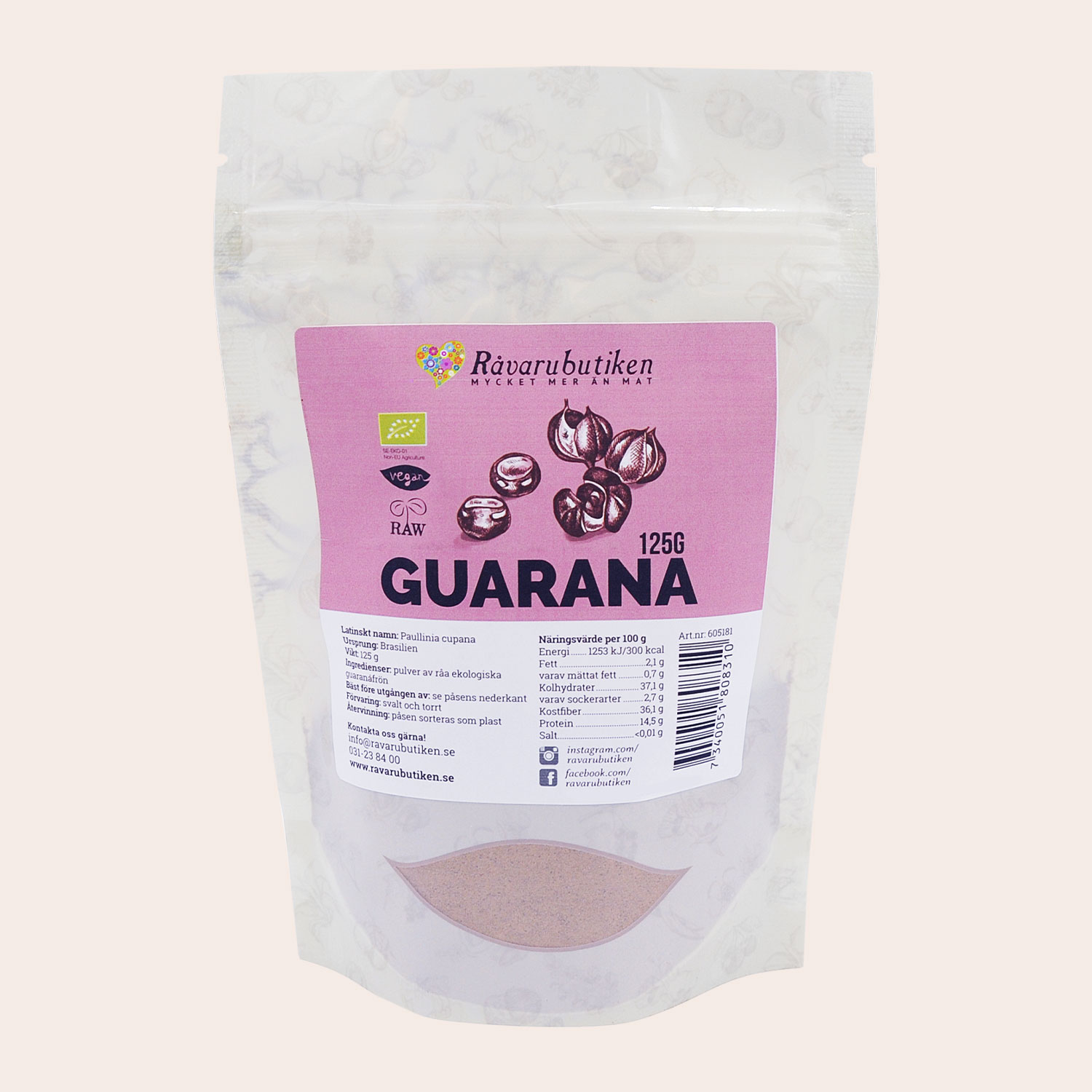 Guarana är en växt som växer naturligt i Amazonas och kan bli upp till 12 meter hög. Pulvret tillverkas av växtens frön, som traditionellt använts i Brasilien i te och matlagning.