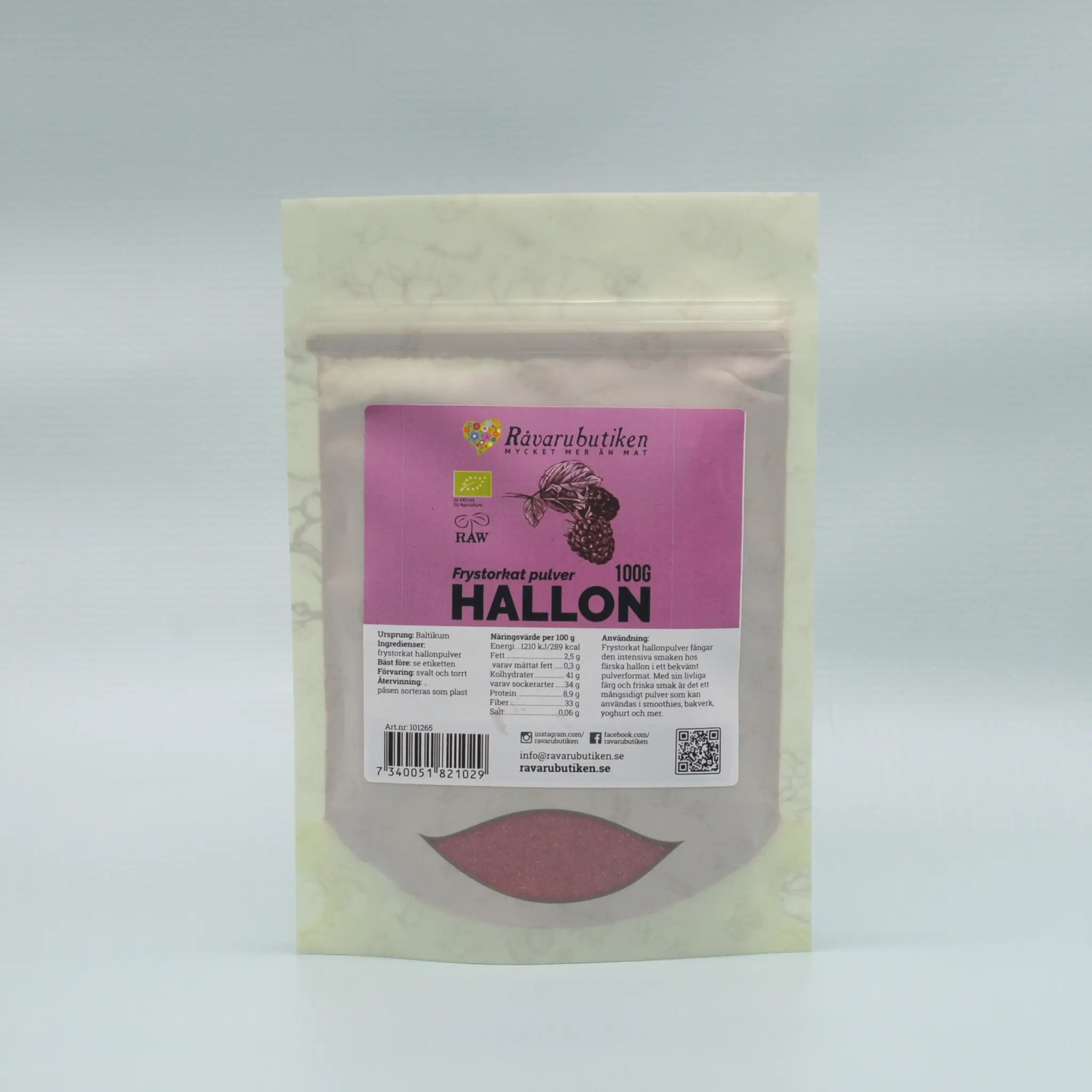 Frystorkat hallonpulver är ett fint pulver framställt av frystorkade ekologiska hallon. Genom den skonsamma frystorkningsprocessen bevaras bärens naturliga smak, färg och arom, vilket ger ett pulver med intensiv hallonsmak och livlig färg.