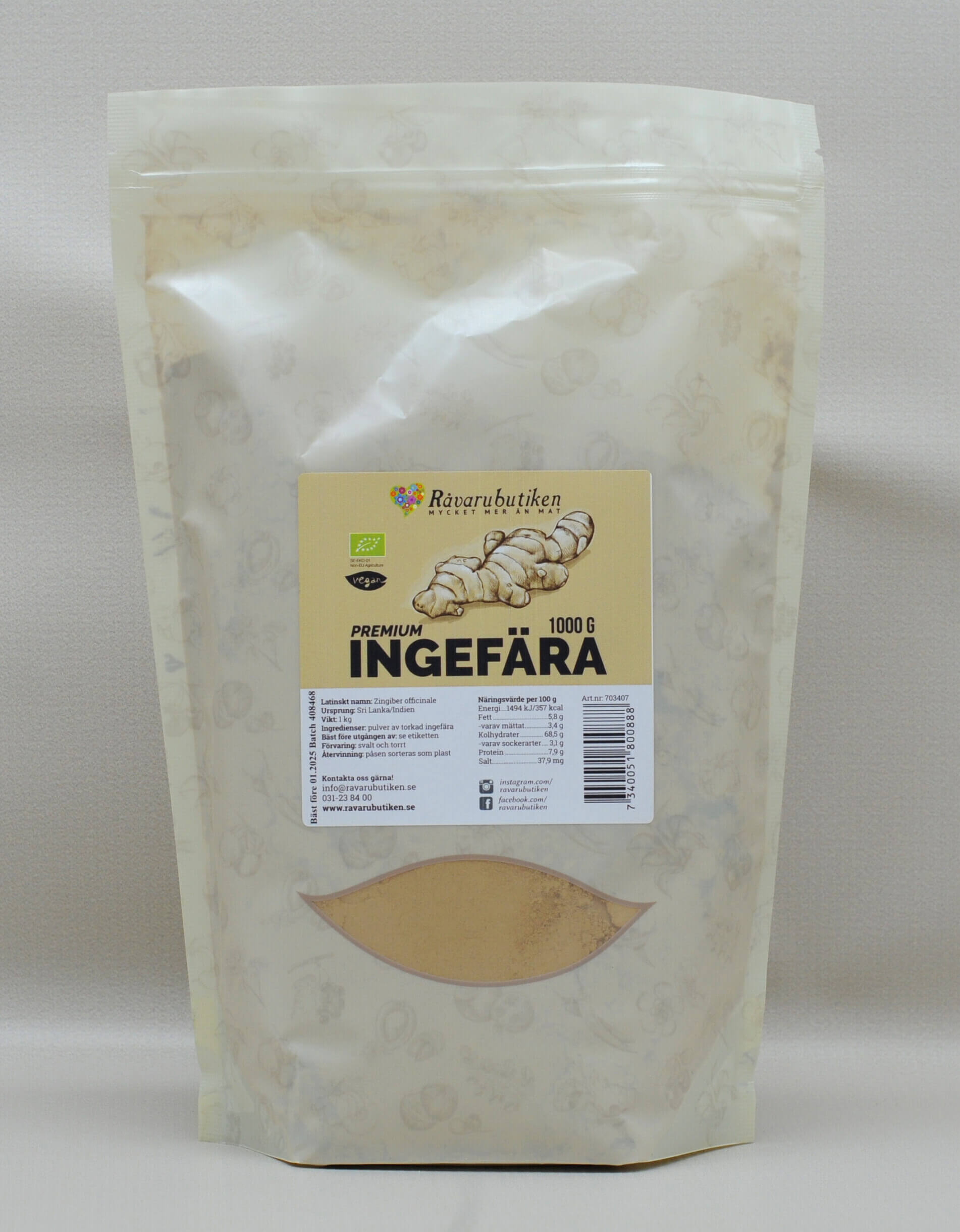 Ekologiskt ingefärapulver framställt av torkad ingefära. Ett finmalet pulver med tydlig och intensiv smak som passar i både matlagning, bakning och dryck.