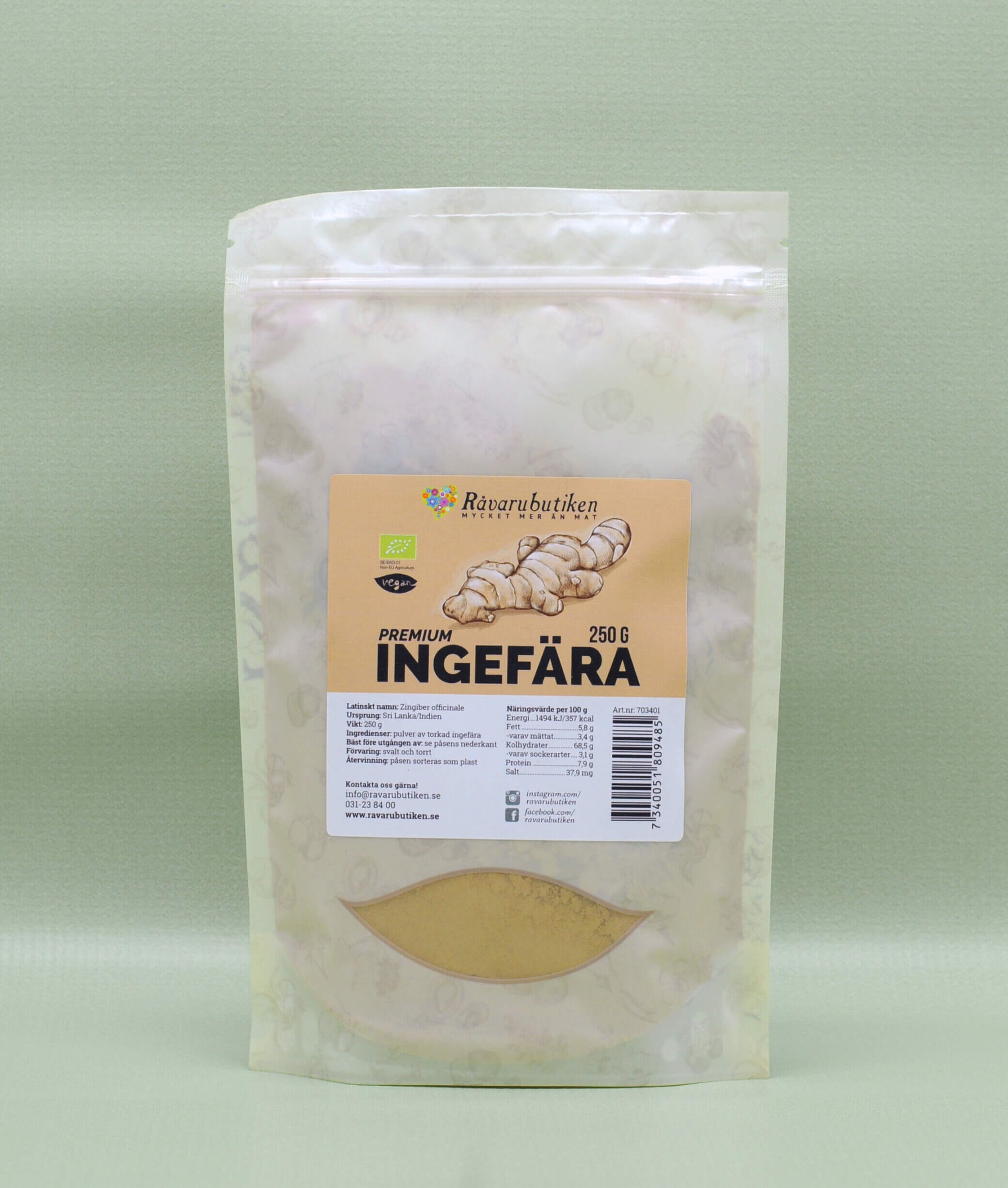 Ekologiskt ingefärapulver framställt av torkad ingefärarot (Zingiber officinale), finmald till ett aromatiskt pulver.
