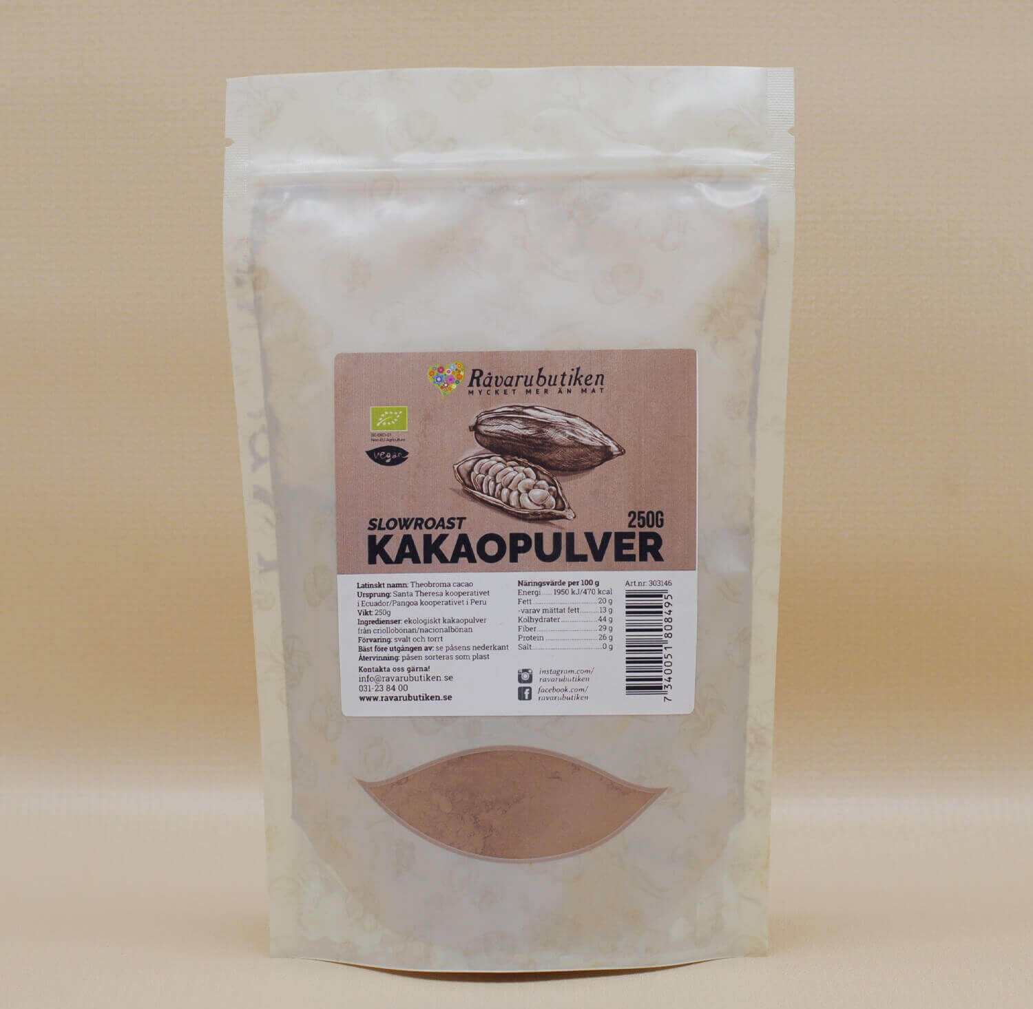 Ekologiskt kakaopulver av hög kvalitet från Pangoakooperativet i Peru. Slowrostat för att ge en rund, mild och fyllig kakaosmak – perfekt i både bakning och drycker.