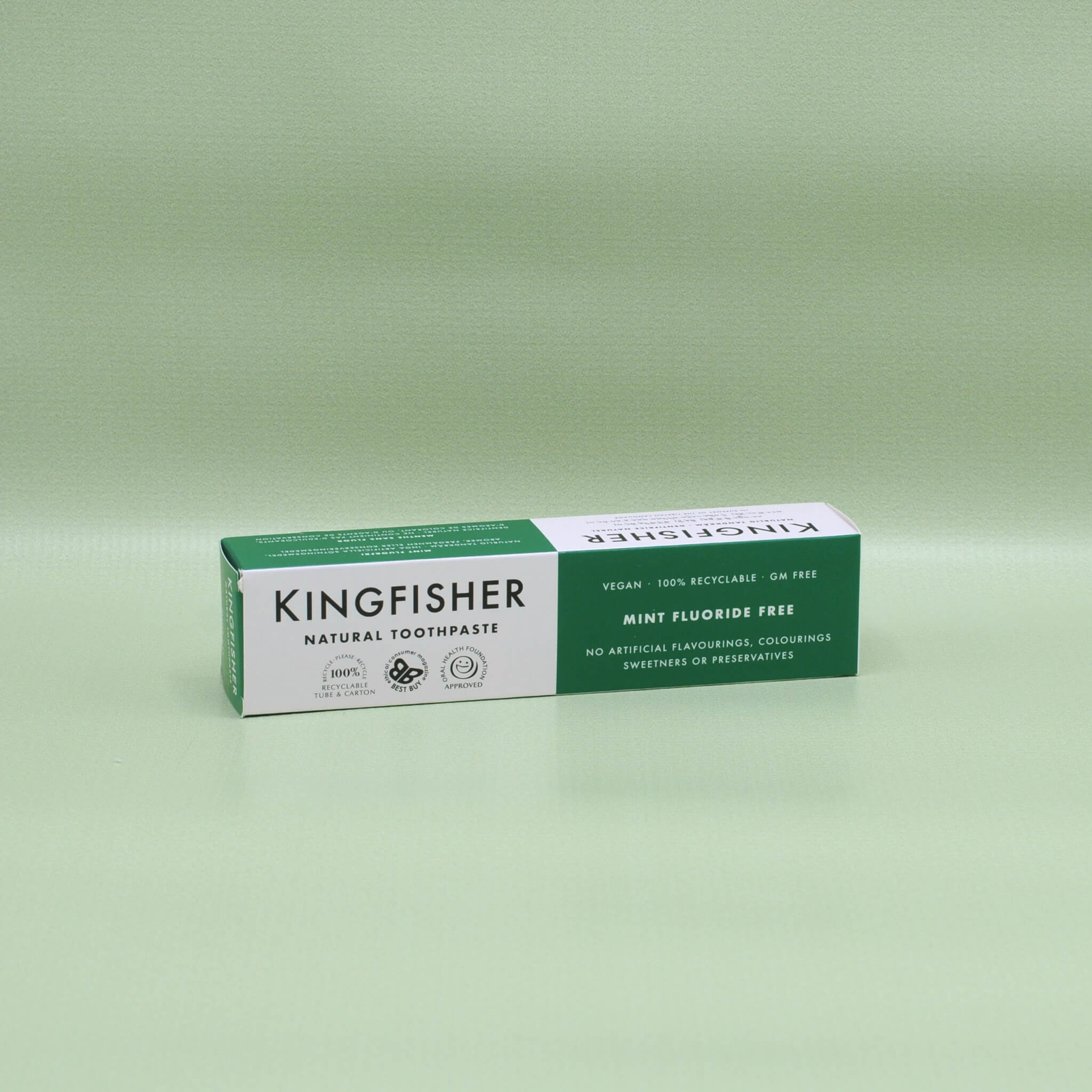 Tandkräm Kingfisher med mintsmak och utan flour. Inga aromämnen, konserveringsämnen, sötningsmedel eller färgämnen. Utan animaliska produkter, GMO och ej testat på djur