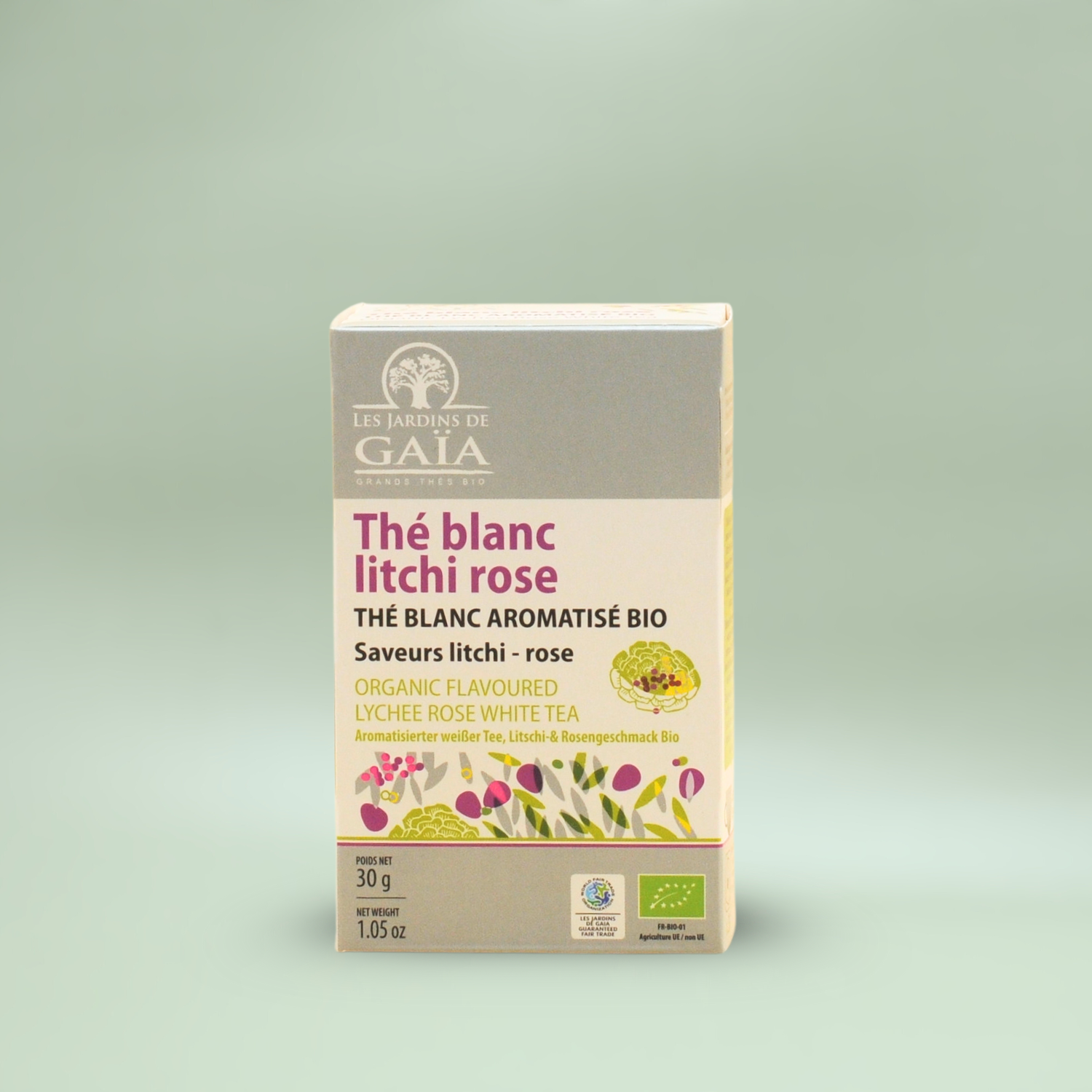 Njut av en sofistikerad och harmonisk kopp te med Les Jardins de Gaïa Flavoured White Tea – en ekologisk blandning som kombinerar det milda och eleganta vita teet med fräscha toner av citrongräs, exotisk litchi och en subtil touch av ros.