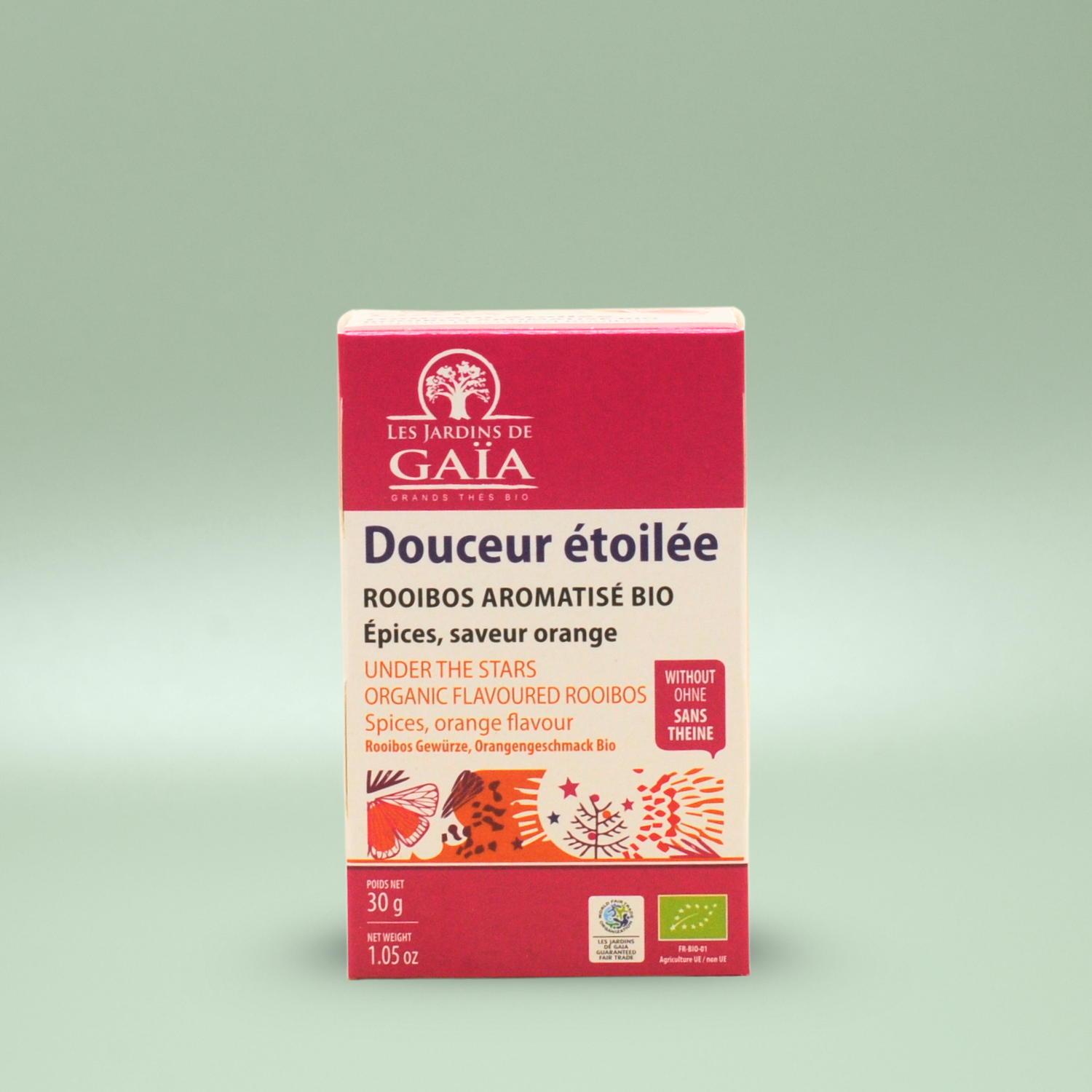 Låt dig svepas in i kvällens lugn med Under The Stars – en värmande, ekologisk rooibosblandning från Les Jardins de Gaïa. Med hela 88 % rooibos och en noga avvägd mix av kryddor, söt apelsinolja och fruktiga inslag från äpple och jordgubb, bjuder detta te på en fyllig och harmonisk smakupplevelse – helt utan koffein.