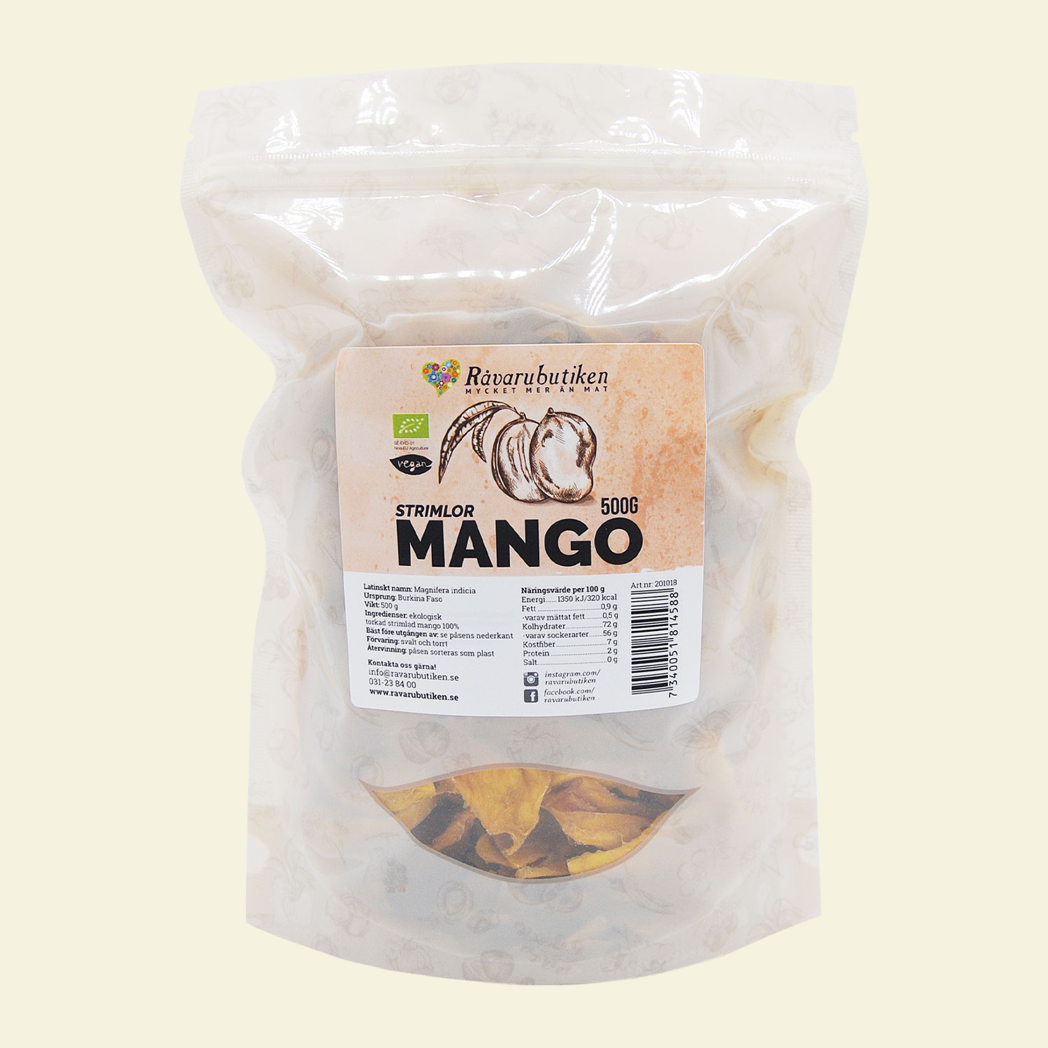 Mangostrimlor är skivad och torkad mango som behåller mycket av fruktens naturliga smak. Mango tillhör familjen sumakväxter och finns i många olika sorter med varierande sötma och syra.