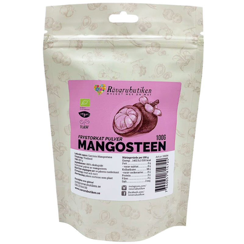 Mangosteen är en tropisk frukt som växer i Asien och kännetecknas av sitt mörklila skal och ljusa fruktkött. I detta pulver används skalet, som frystorkas och mals till ett fint pulver.