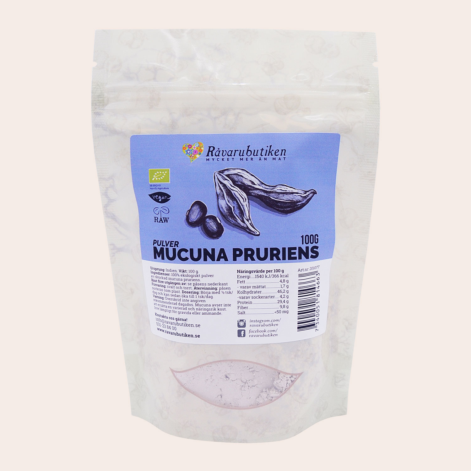Ekologiskt mucuna pruriens pulver är ett finmalet pulver framställt av frön från en tropisk baljväxt. Växten växer naturligt i tropiska och subtropiska områden, bland annat i Afrika, Asien och kring Stillahavsöarna.