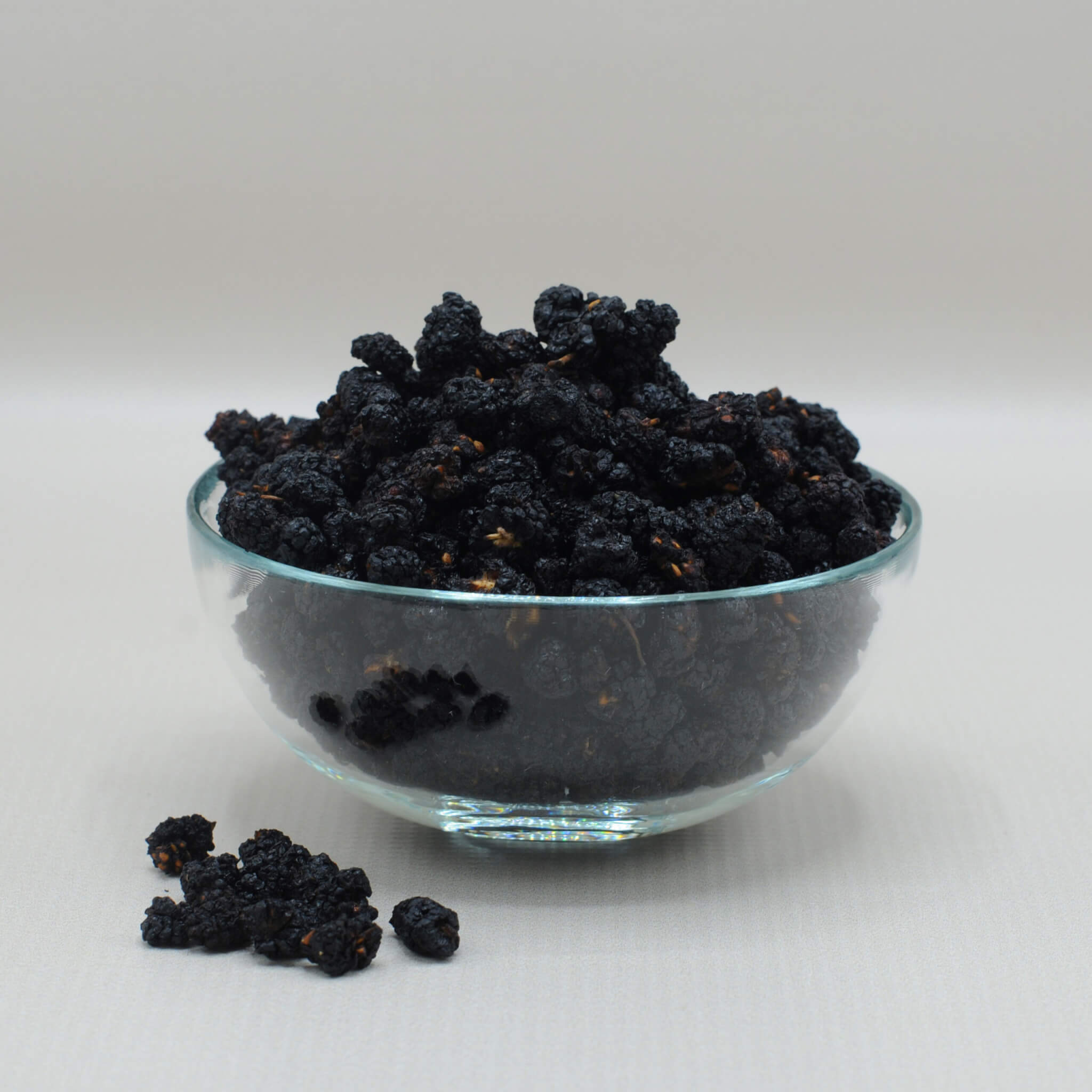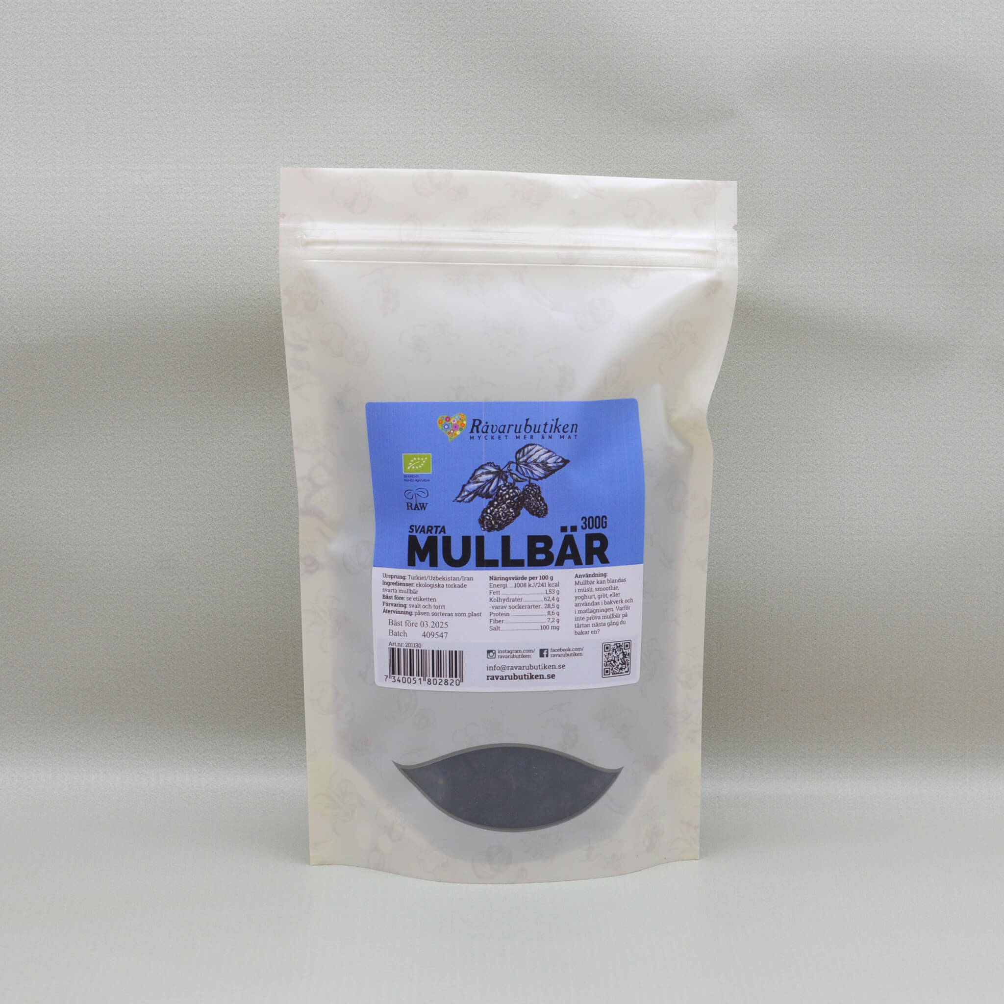 Svarta mullbär är en uppskattad torkad frukt med naturligt söt och fyllig smak. Dessa ekologiska mullbär är varsamt torkade för att bevara fruktens naturliga arom och mjuka konsistens.