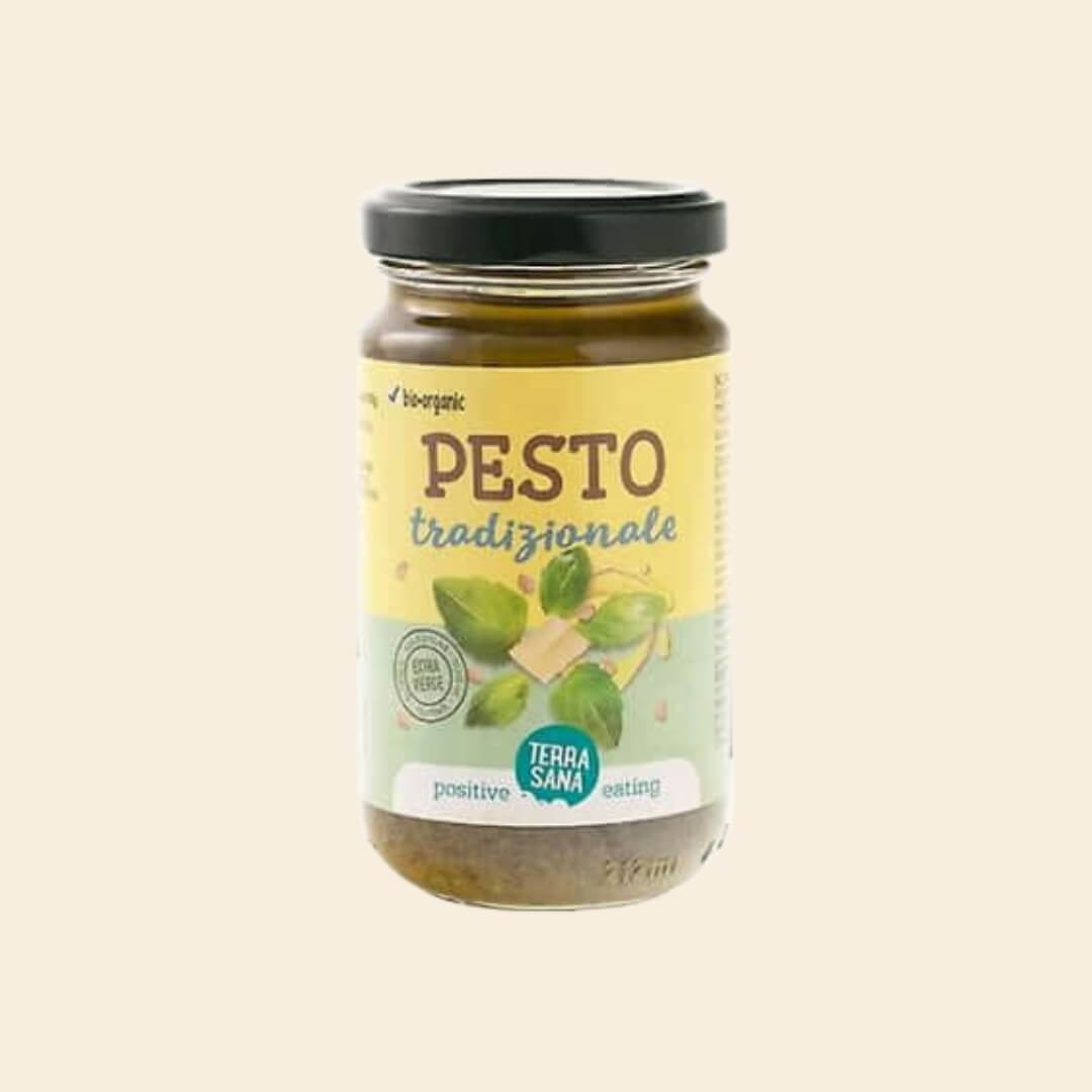 Inga andra nötter än pinjenötter används i vår pesto tradizionale. Detta ger en lyxig och unik traditionell smak till peston. En väldoftande, populär pesto som är gjord av enbart rena, ekologiska råvaror och är helt italiensk. Smakrik som smaksättare i pasta, soppor och såser.