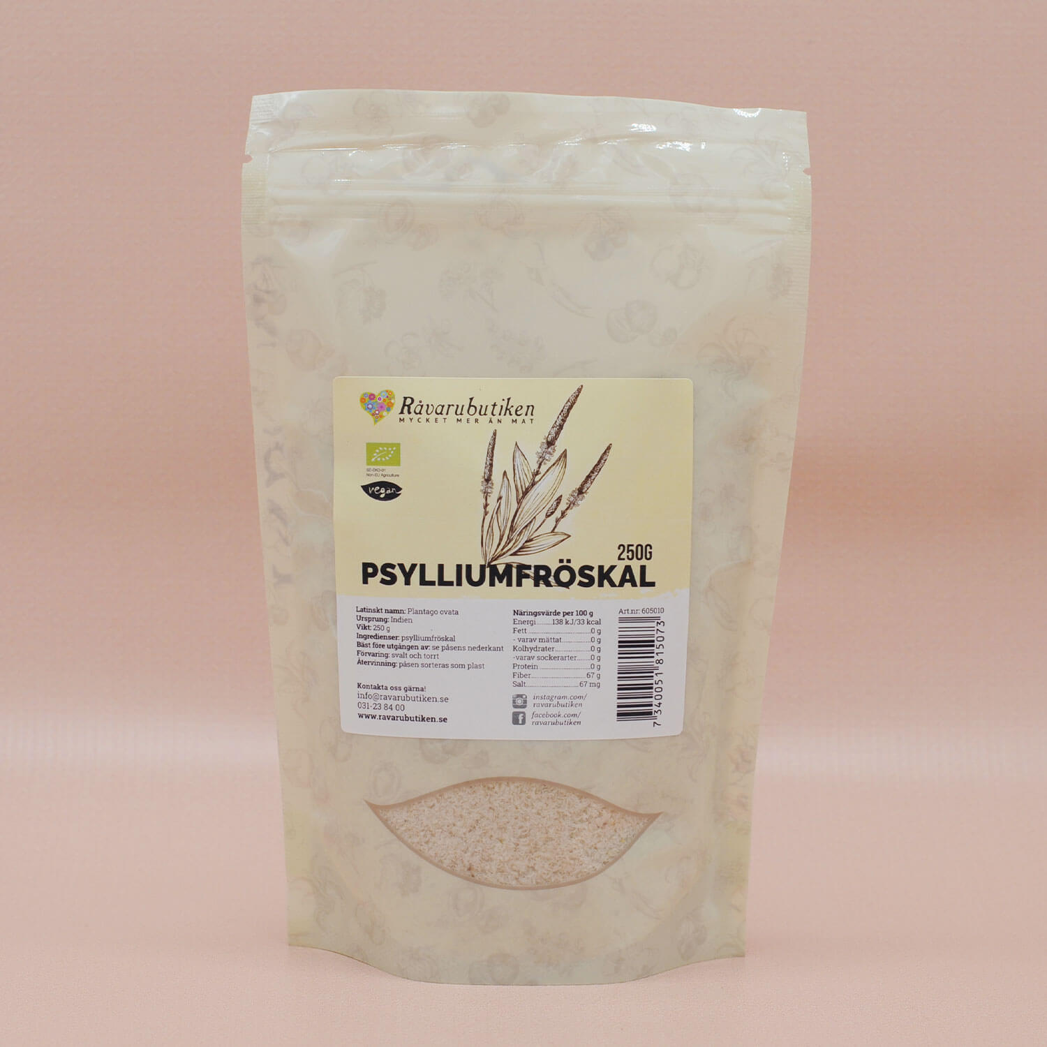 Psylliumfröskal kommer från växten Plantago ovata, som främst odlas i Indien och Pakistan. Skalen har förmågan att binda vätska och svälla, vilket gör att de får en geléliknande konsistens.