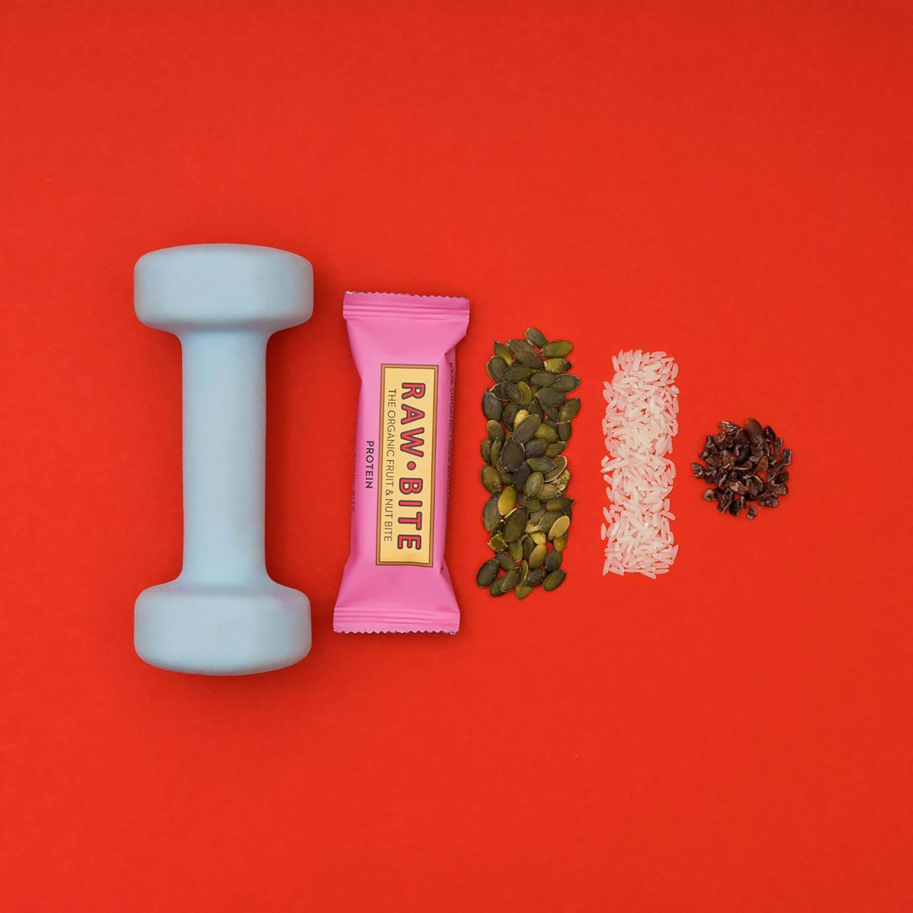 En mättande rawfood-bar med smak av choklad och nötter i en nyttig blandning av risprotein, dadlar, russin, kakao, nötter och pumpafrön.