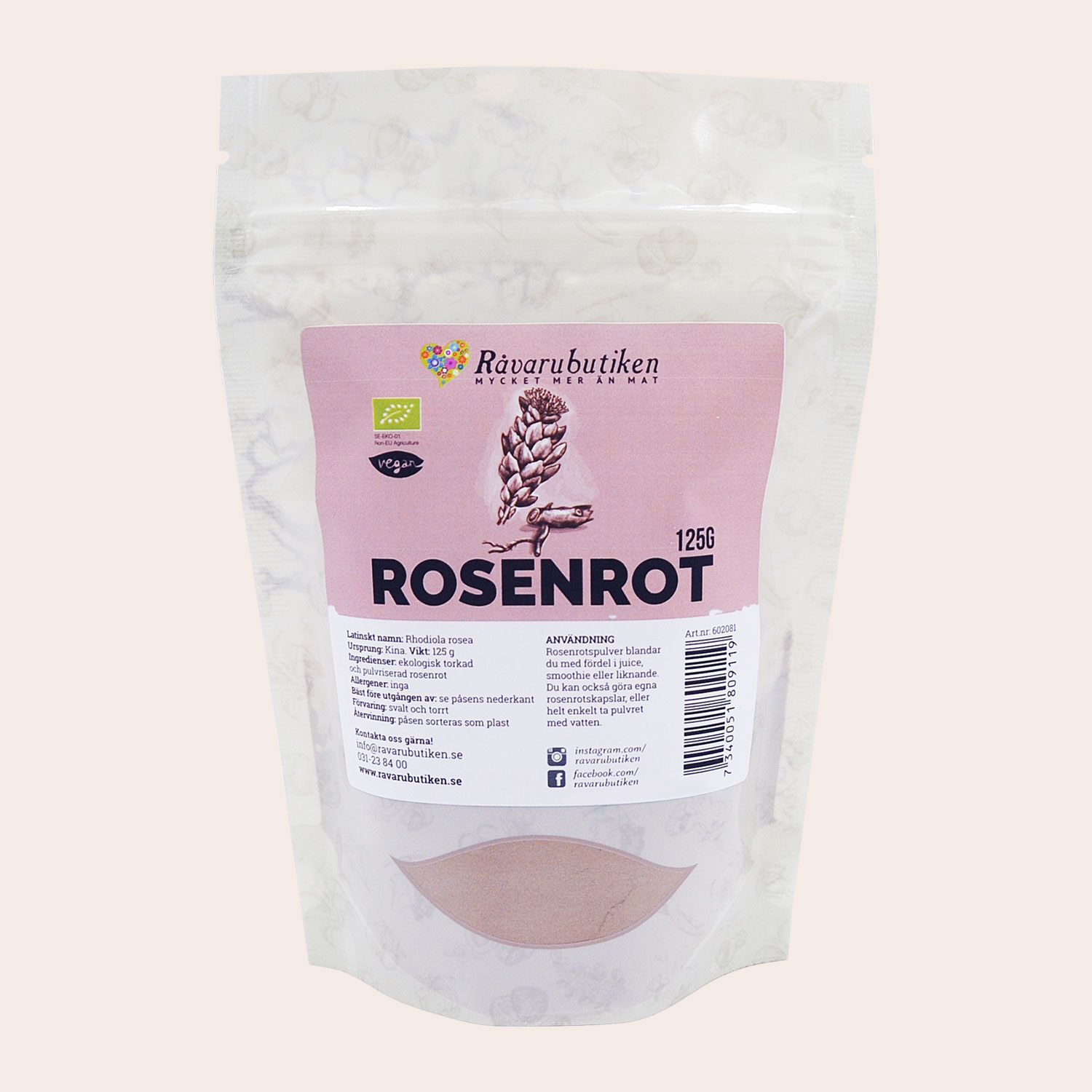 Ekologiskt rosenrotspulver framställt av torkad och finmalen rot av Rhodiola rosea. Ett traditionellt växtbaserat tillskott som enkelt kan användas i dryck och smoothies.