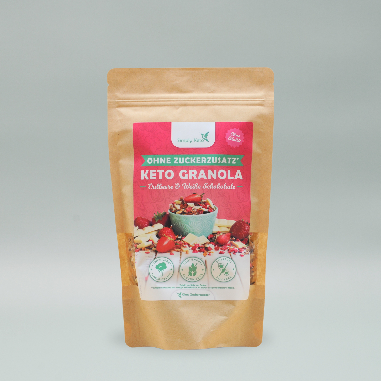 Vårt Lower-Carb & ketovänliga granola med jordgubb och vit choklad ger dig en energifylld och god start – eller ett mättande mellanmål helt utan dåligt samvete!