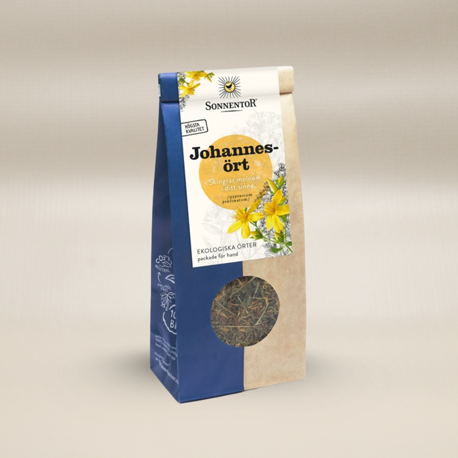 Sonnentors ekologiska te med johannesört har en mild, lätt gräsaktig smak och tillverkas av torkade delar från hela johannesörten (Hypericum perforatum). Johannesört har en lång tradition inom naturmedicin och används ofta för sitt potentiella stöd för mentalt välbefinnande.