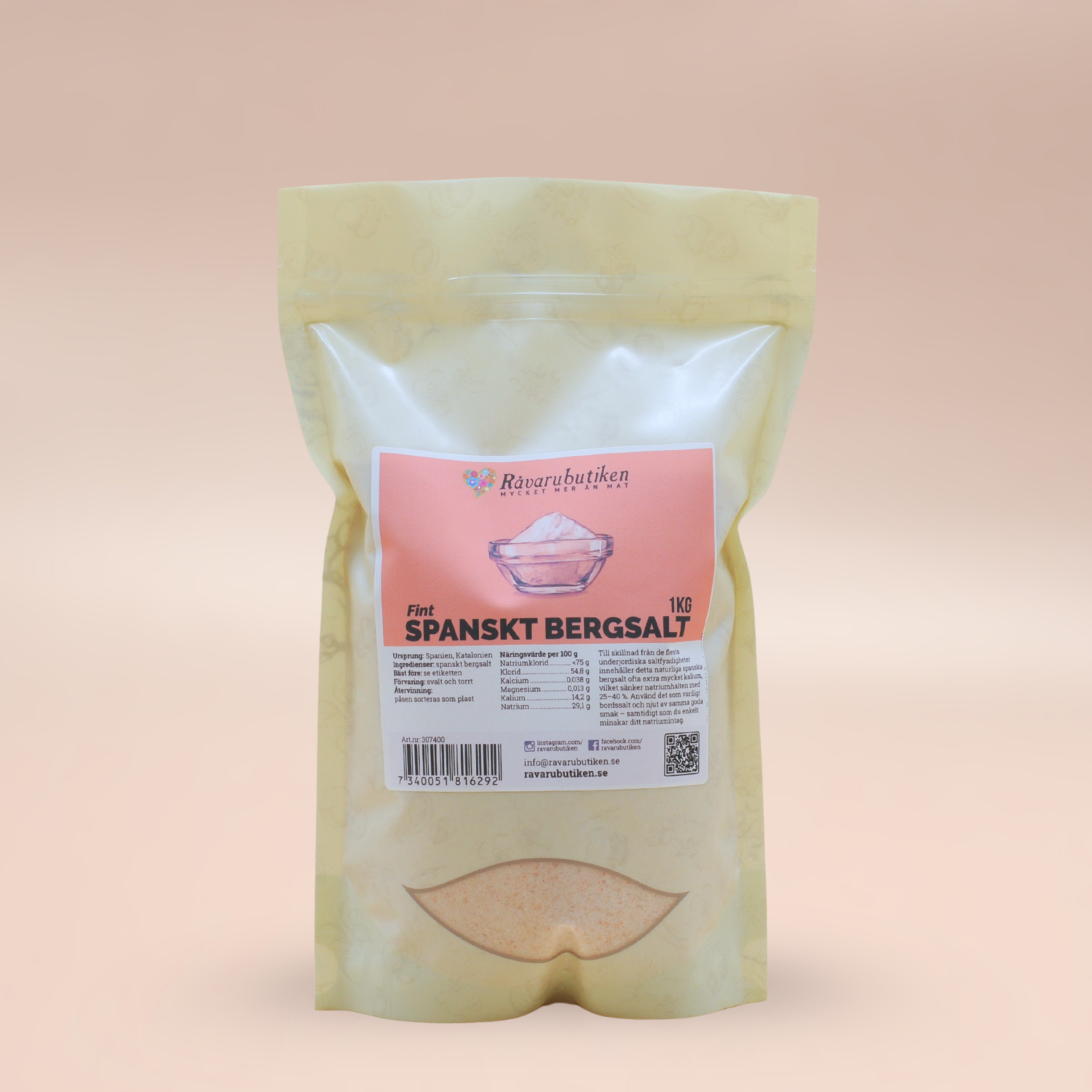 Spanskt Bergssalt Fint 1kg är ett 100 % naturligt bergsalt som utvinns ur uråldriga saltfyndigheter i det katalanska inlandet i Spanien. Dessa saltavlagringar är rester från ett förhistoriskt urhav som med tiden kapslats in i berggrunden.