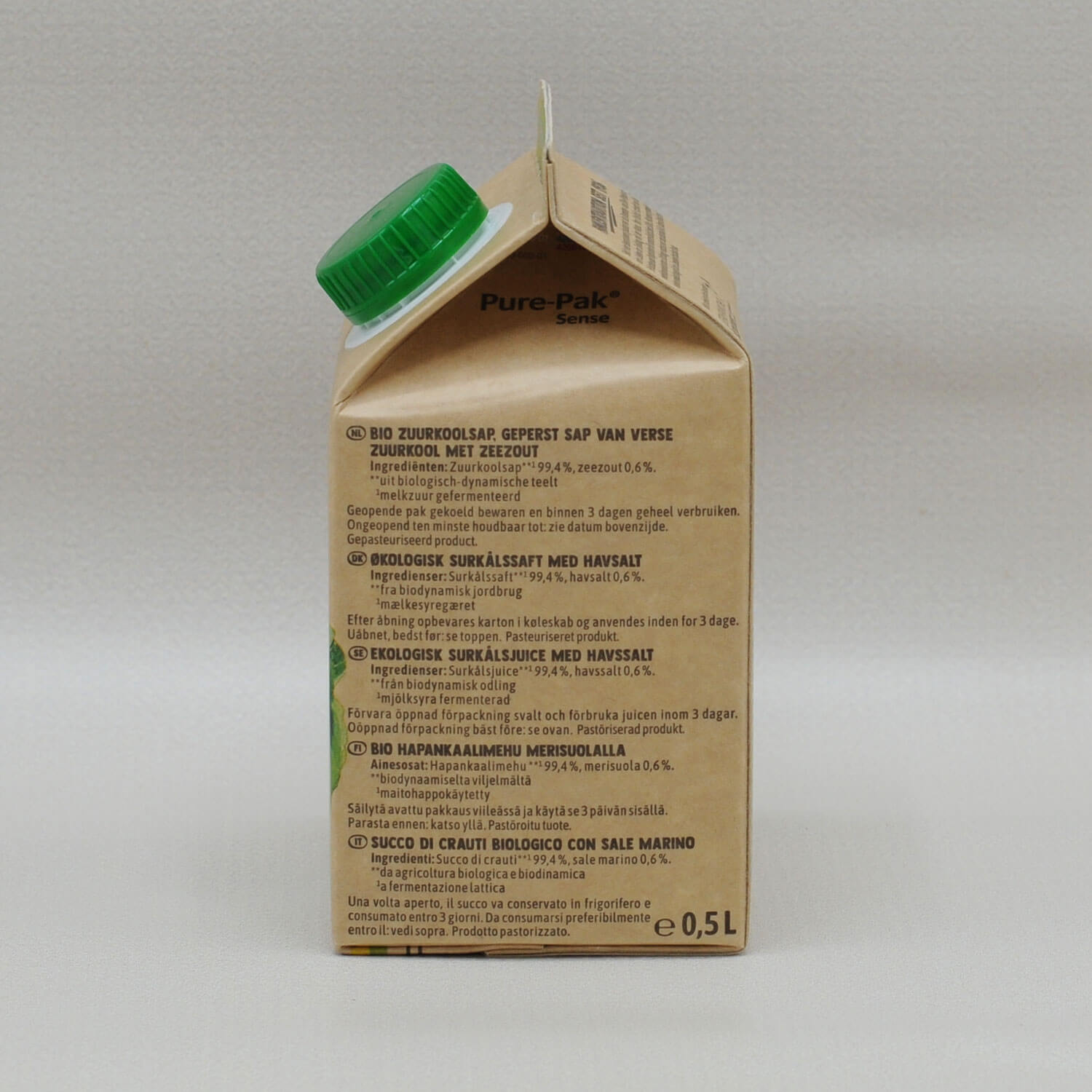 Ingredienser: surkåljuice**, salt 0, 6 % (* från kontrollerad ekologisk odling, ** från kontrollerad bio dynamisk odling)