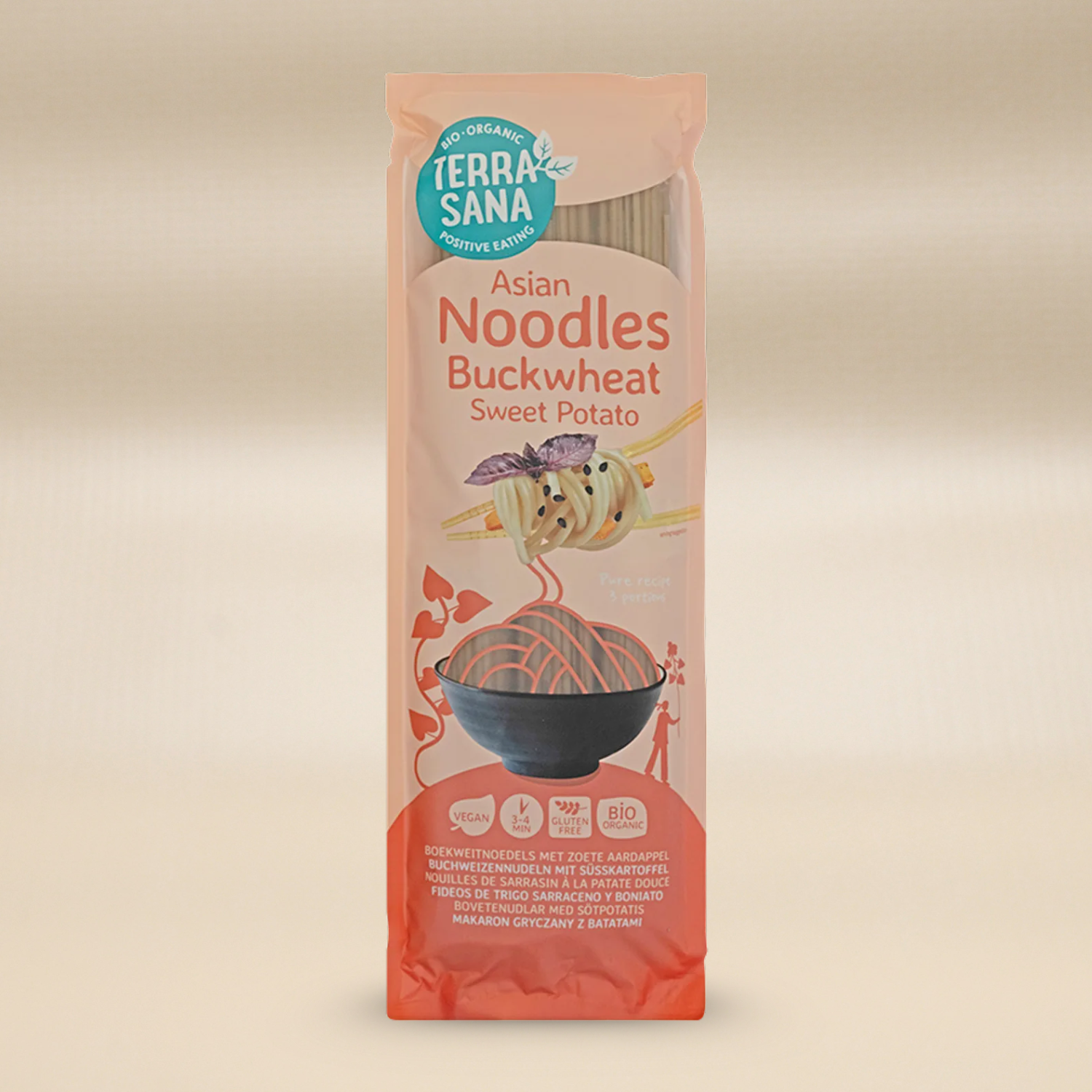 Bovete blir allt mer populärt i europeisk matlagning, men i Japan har man använt denna naturligt glutenfria råvara i århundraden. Våra bovetenudlar består av 95% bovete och 5% sötpotatis. De passar fantastiskt bra med miso (soppa), sjögräs och klassiska japanska smaksättare som tamari, mirin och sesamolja. Finns i fem andra glutenfria varianter, baserade på fullkornsris, vitt ris eller svart ris. Användning Koka i rikligt med vatten 3–4 minuter. Häll av och skölj med kallt vatten. Förvaring Förvara lufttätt på en torr, mörk plats i rumstemperatur (max 20 °C) efter öppning.