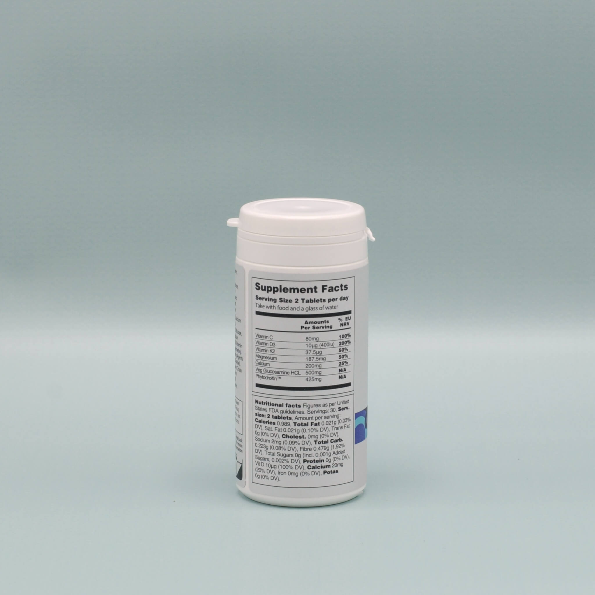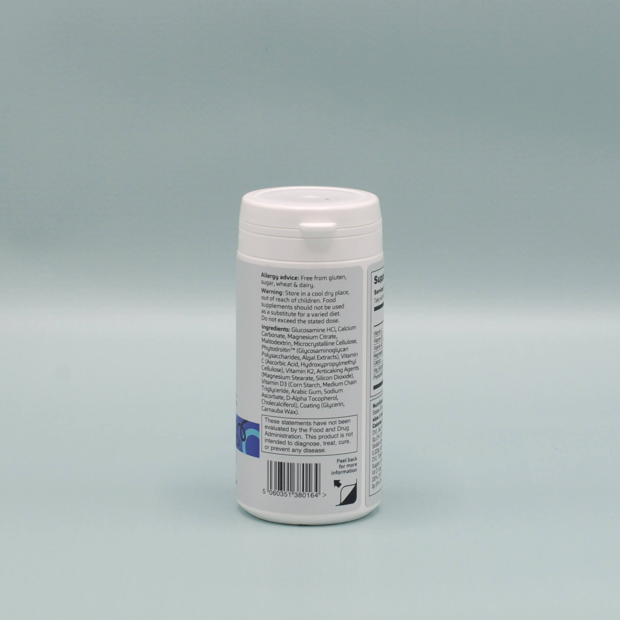 Glukosamin HCl, Kalciumkarbonat, Magnesiumcitrat, Maltodextrin, Mikrokristallin cellulosa, Phytodroitin™ (Glykosaminoglykan polysackarider, Algekstrakt), Vitamin C (Askorbinsyra, Hydroxipropylmetylcellulosa), Vitamin K2, Antiklumpningsmedel (Magnesiumstearat, Kiseloxid), Vitamin D3 (Majstärkelse, Mediumkedjiga triglycerider, Arabiskt gummi, Natriumaskorbat, D-alfa-tokoferol, Kolekalciferol), Beläggning (Glycerin, Carnaubavax).
