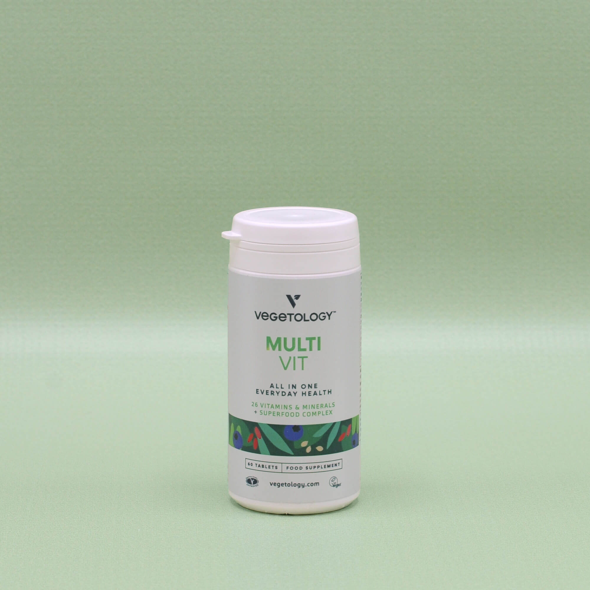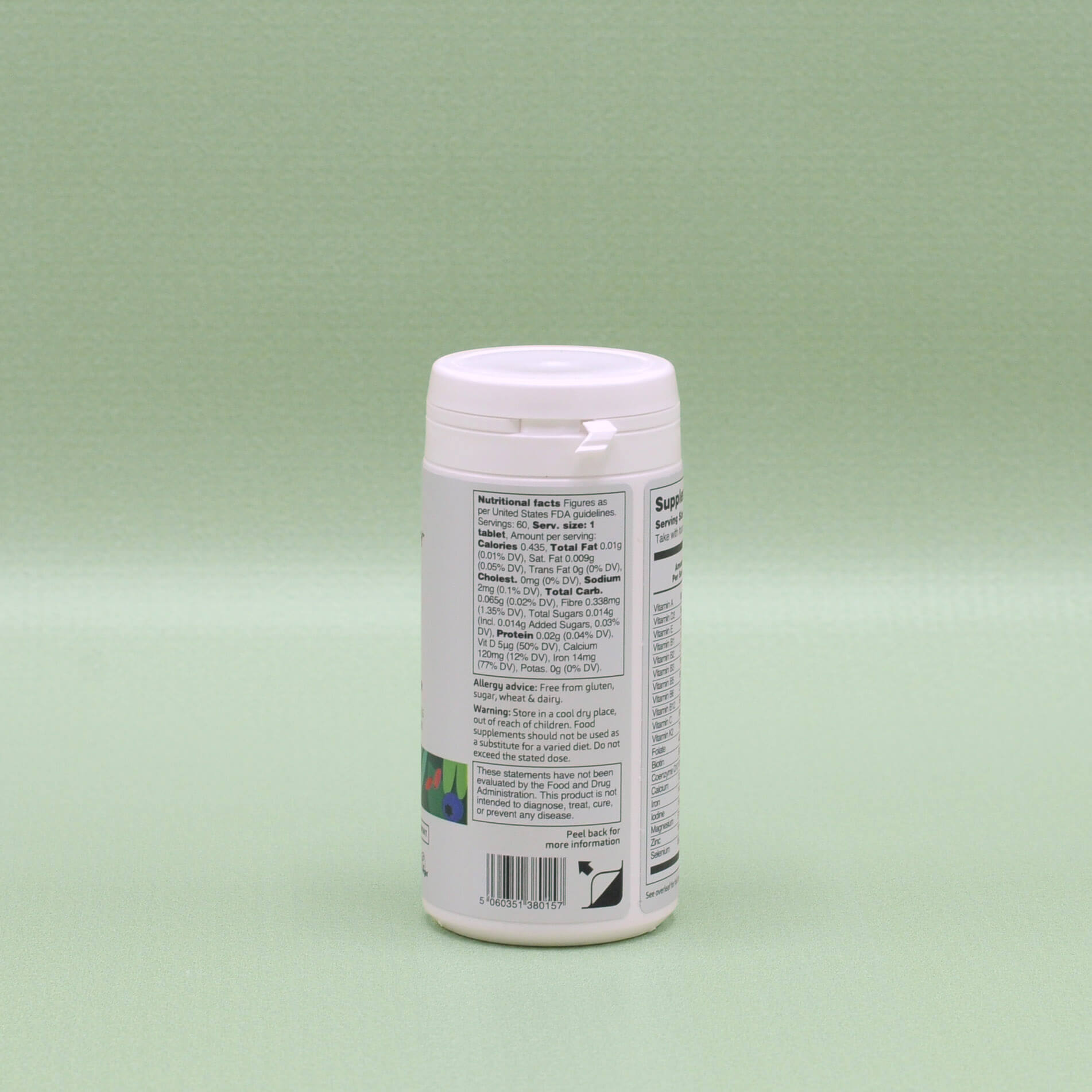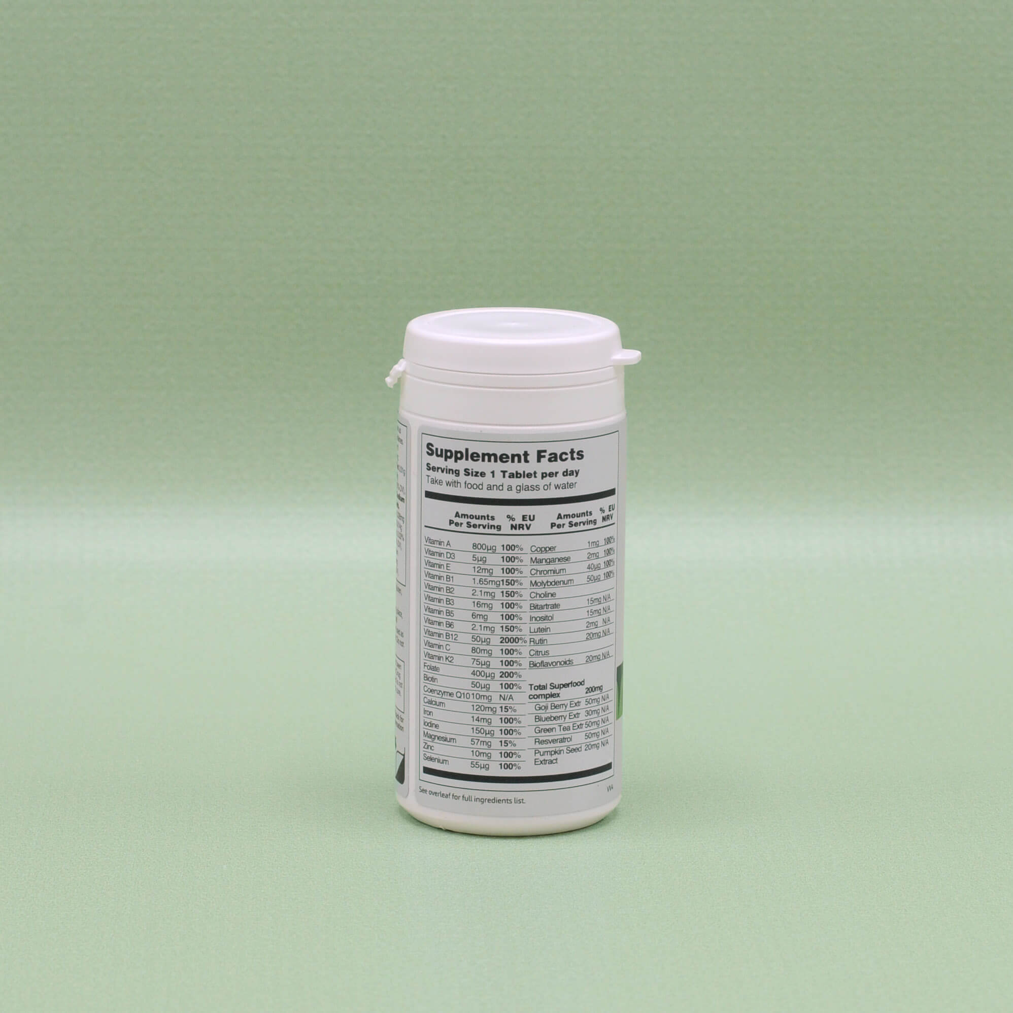 Calcium Carbonate, Magnesium Citrate, Microcrystalline Cellulose, Ascorbic Acid, Super Food Blend (Goji Berry Extract, Blueberry Extract, Green Tea Extract, Pumpkin Seed Extract, Resveratrol (Grape Extract)), Citrus Bioflavonoids Complex, Choline Bitartrate, Iron Amino Acid Chelate, D-Alpha Tocopherol, Nicotinamide, Anticaking agents (Magnesium stearate, Silicon Dioxide), Rutin, Inositol, Calcium Pantothenate, Pyridoxine Hydrochloride, Thiamine Hydrochloride, Bladderwrack Extract, Riboflavin, Zinc Citrate, Selenium Methionine, Mixed Carotenoid Complex, Vitamin A (Maltodextrin, Corn Starch, Vitamin A), Manganese Sulphate, Co-enzyme Q10, Lutein Powder, Copper Sulphate, Vitamin D (Medium Chain Triglyceride, Arabic Gum, Sodium Ascorbate, Cholecalciferol), Beta Carotene, Vitamin K2, Folate, Chromium Picolinate, Sodium Molybdate, Biotin, Vitamin B12, Tablet coating (Hydroxypropylmethyl Cellulose, Glycerol).
