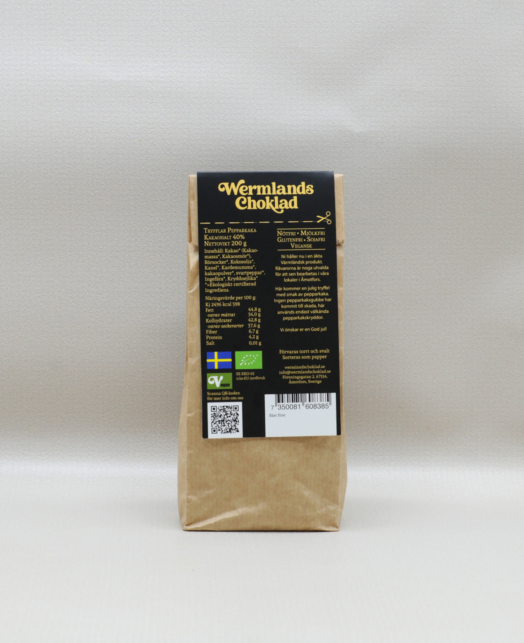 Du kan vara försäkrad om att Wermlands Choklads arbete handlar om både din hälsa och vår planets välmående. Det mest underbara är att Pepparkakstryfflarna inte bara är snälla mot kroppen, utan de tar också hänsyn till dina allergier. Genom extra noggranna åtgärder i deras tillverkningsprocess säkerställs att tryfflarna är säkra att njuta av, även för dig med allergier eller intoleranser.