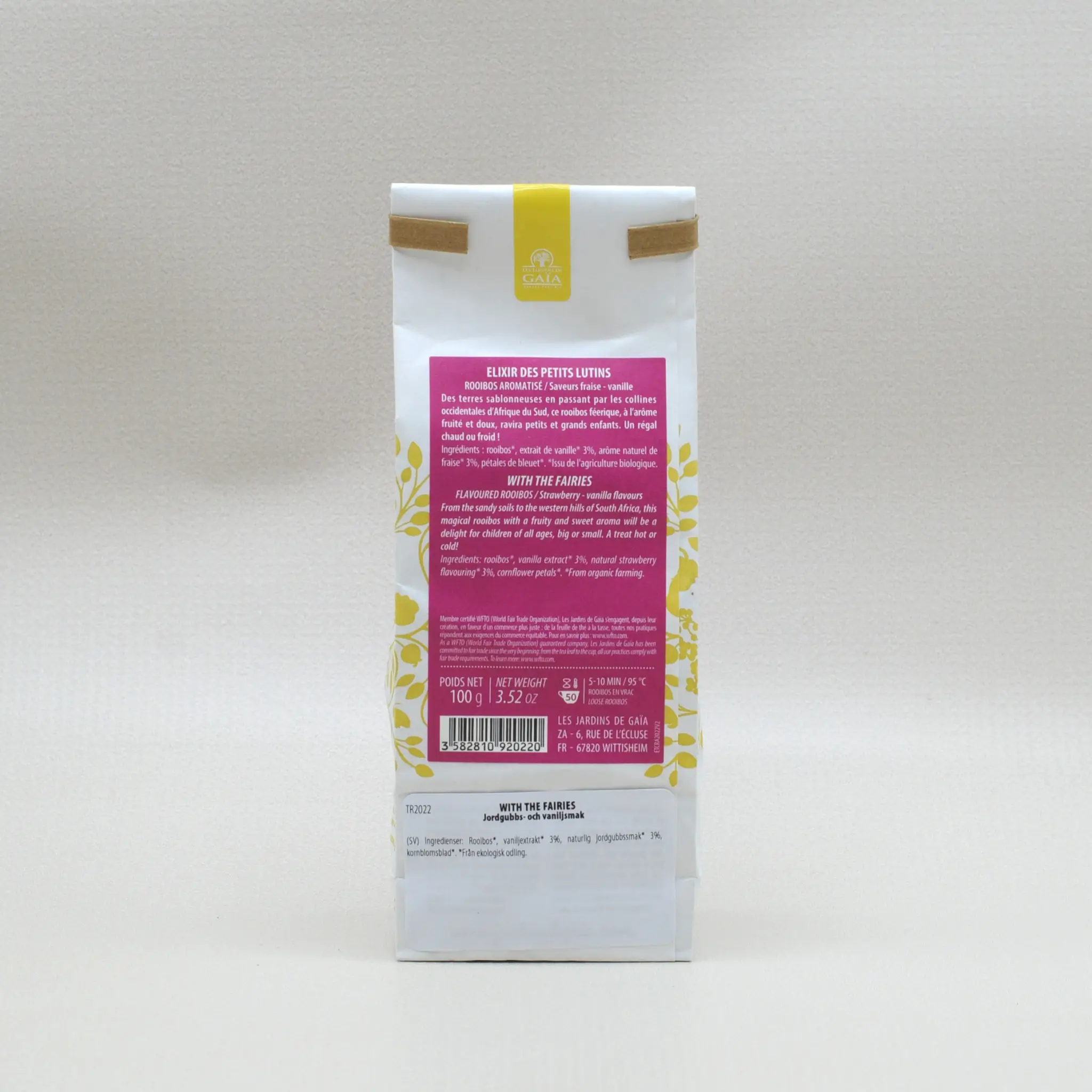 Ingredienser: rooibos*, vaniljextrakt* 3%, naturlig jordgubbsarom* 3%, blåklintsblad*. *Från ekologiskt jordbruk.